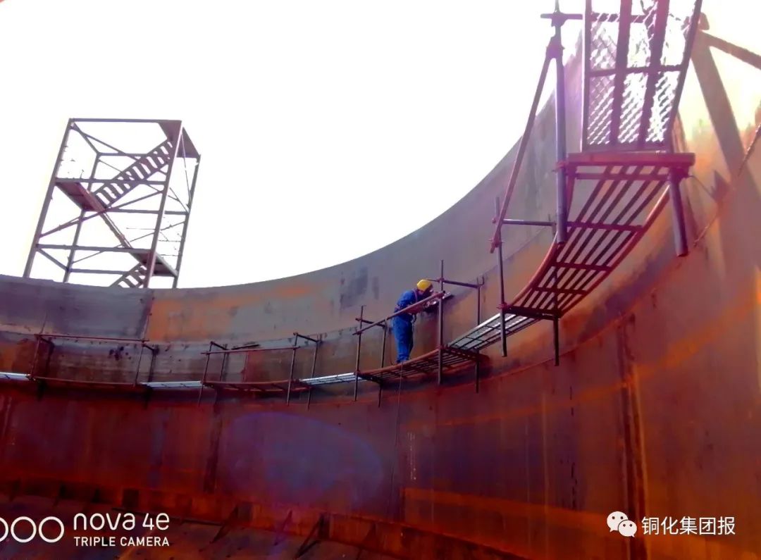 為促進(jìn)礦山綠色發(fā)展,新橋礦業(yè)公司投資近2200萬元,對全尾砂充填系統(tǒng)進(jìn)行技改。該工程于2月動工,預(yù)計7月底收官運行。屆時,選礦廠、選鐵廠生產(chǎn)尾砂及污水處理站淤泥經(jīng)混合處理可全部用于井下充填,實現(xiàn)礦山生產(chǎn)固廢零排放。圖為5月21日,工人正在施工現(xiàn)場焊接直徑18米的深錐濃密池。 特約記者/ / 朱常林/ / 攝